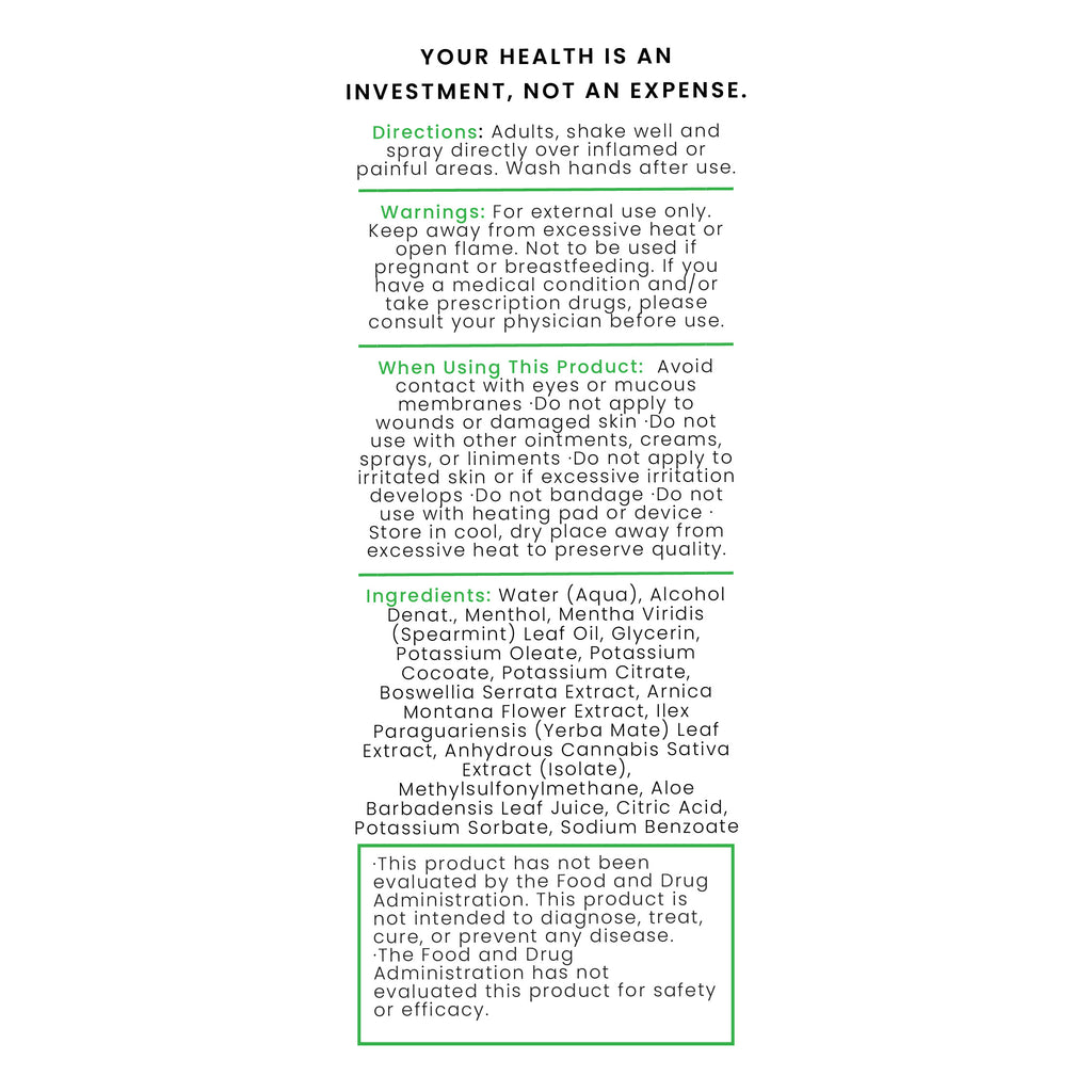 Look no further than our 2000 MG CBD Infused Topical Spray! Our CBD topical spray is made with broad-spectrum hemp extract and is infused with 2000 MG of CBD. This powerful topical spray provides fast-acting relief and is perfect for targeted areas of discomfort. Simply spray onto the desired area, letting air dry until absorbed. We have the best cbd pain relief spray which is non-psychoactive and will not get you high. It is also THC-free, so you can rest assured knowing that you are not consuming any harmful chemicals. Our CBD topical spray is third-party lab-tested for potency and purity, so you can be sure that you are getting a high-quality product. Shop now and experience the power of CBD!