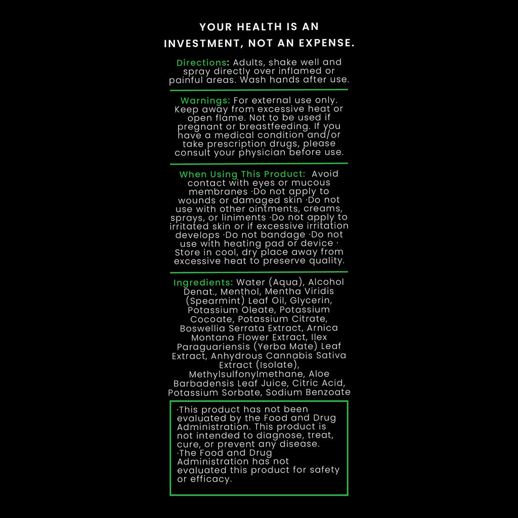 Directions: Adults, shake well and spray directly over inflamed or painful areas. Allow product to air dry or massage into skin. Use as needed throughout the day to relax muscles and help injuries recover. Use before, during or after activities for best results. Cooling sensation will activate in 2-5 minutes. Wash hands with soap and water after each use and enjoy the benefits of FlexCBD.